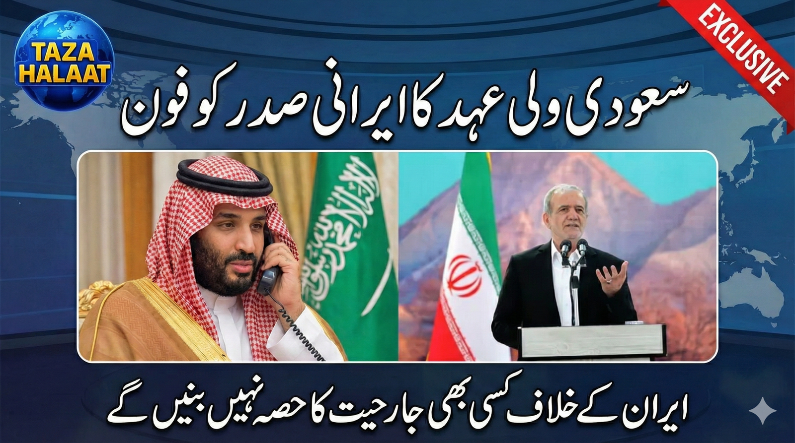 ریاض/تہران: مشرقِ وسطیٰ میں بڑھتی ہوئی کشیدگی اور علاقائی جنگ کے منڈلاتے بادلوں کے درمیان سعودی ولی عہد شہزادہ محمد بن سلمان نے ایرانی صدر سے ٹیلیفونک رابطہ کیا ہے۔ اس گفتگو میں سعودی ولی عہد نے دوٹوک الفاظ میں واضح کیا ہے کہ سعودی عرب، ایران کے خلاف کسی بھی قسم کے تشدد، فوجی کارروائی یا جنگ کا سخت مخالف ہے اور اپنی سرزمین کو پڑوسی ملک کے خلاف استعمال کرنے کی اجازت ہرگز نہیں دے گا۔