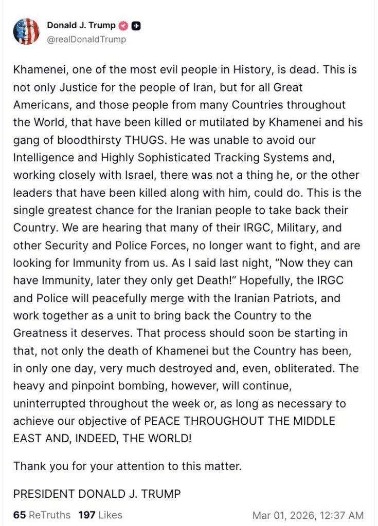اس سے قبل امریکی صدر ٹرمپ اور اسرائیلی وزیر اعظم نیتن یاہو نے سپریم لیڈر کو قتل کرنے کا اعلان کیا۔ صدر ٹرمپ نے باقی ایرانی قیادت کو ہتھیار ڈالنے کا حکم دیا ۔
