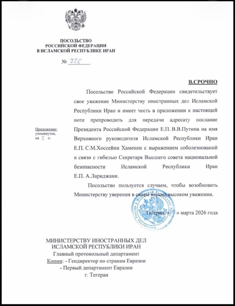 روس کی جانب سے جاری کیے گئے سرکاری مراسلے میں کہا گیا ہے کہ علی لاریجانی ایک تجربہ کار، مدبر اور دوراندیش سیاستدان تھے جنہوں نے نہ صرف ایران کے قومی مفادات کا بھرپور دفاع کیا بلکہ ماسکو اور تہران کے درمیان اسٹریٹجک تعلقات کو مضبوط بنانے میں بھی اہم کردار ادا کیا۔