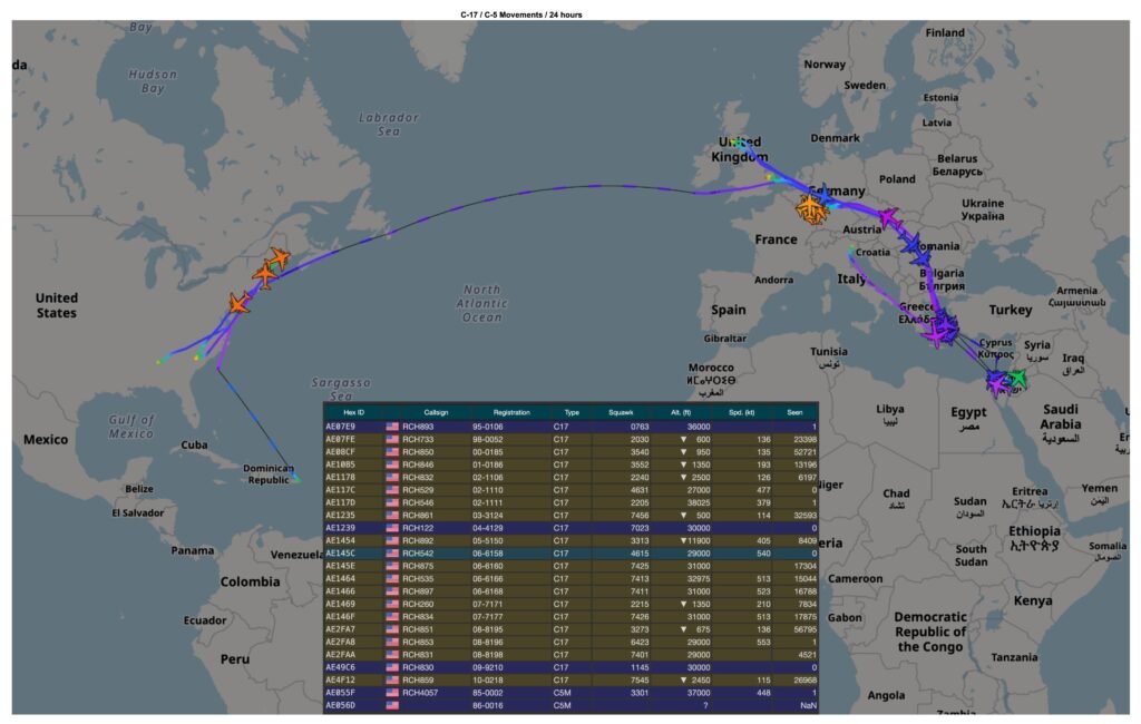 واشنگٹن/یورپ: مشرقِ وسطیٰ میں بڑھتی ہوئی کشیدگی کے دوران امریکی فضائیہ (USAF) کی سرگرمیوں میں غیر معمولی اضافہ دیکھا گیا ہے۔ اوپن سورس فلائٹ ٹریکنگ ڈیٹا کے مطابق گزشتہ 24 گھنٹوں کے دوران کم از کم 46 فضائی ایندھن بردار (ٹینکر) طیارے یورپ کے مختلف اڈوں پر منتقل کیے گئے، جب کہ 23 سی-17 اور سی-5 کارگو پروازیں مشرقِ وسطیٰ کی جانب بھیجی گئیں۔ مجموعی طور پر اب تک 193 ائیر لفٹ مشنز خطے کی جانب ریکارڈ کیے جا چکے ہیں جبکہ مزید پروازیں جاری ہیں۔